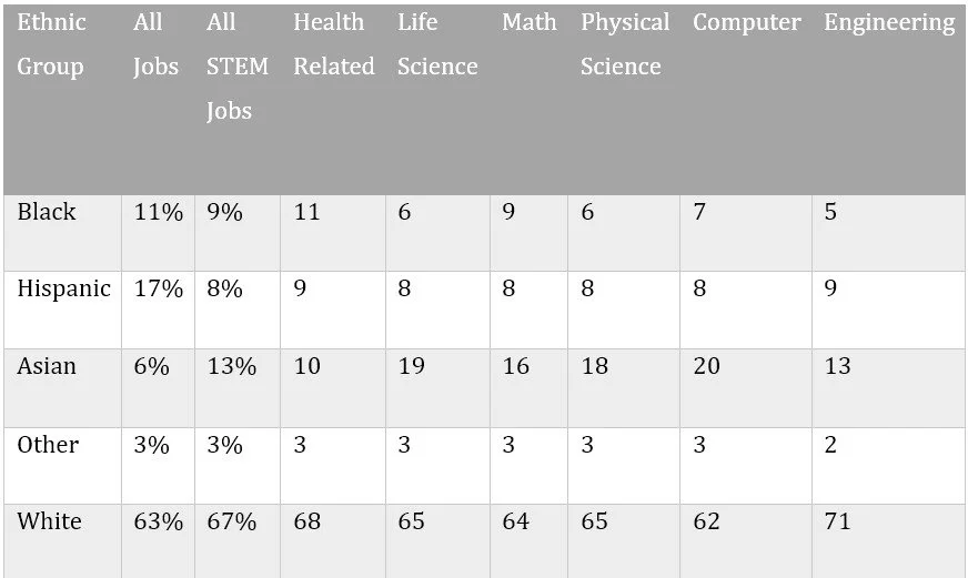 Fig: This chart organizes the data for All Jobs and All STEM Jobs by ethnic group